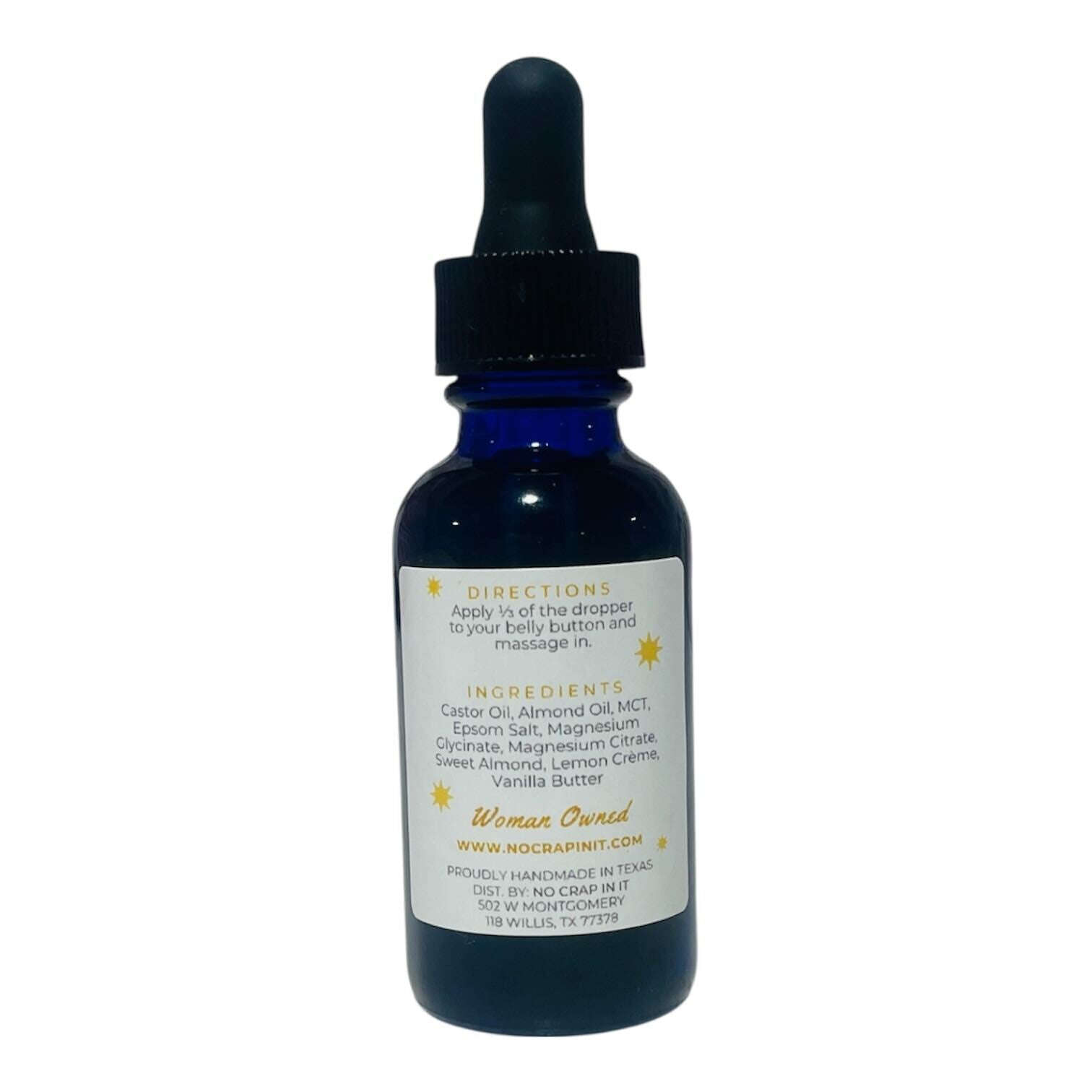 Apply: Use ⅓ of the dropper directly into your belly button.
