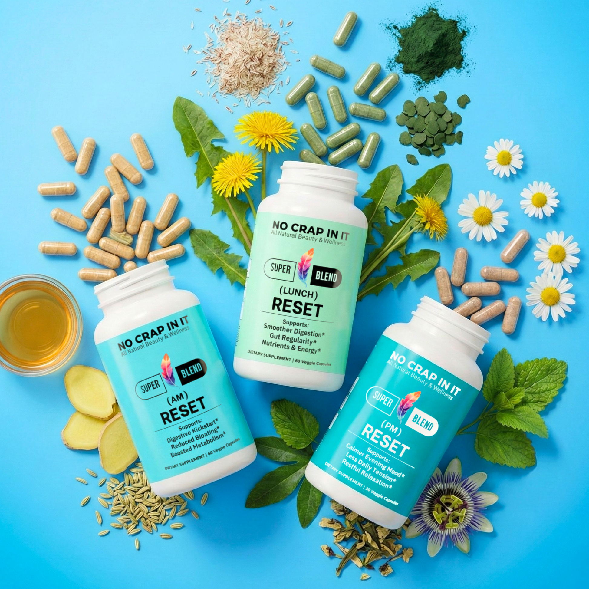 - Lunch Reset: Psyllium (300mg), Dandelion (200mg), Chlorella (200mg), Spirulina (200mg)